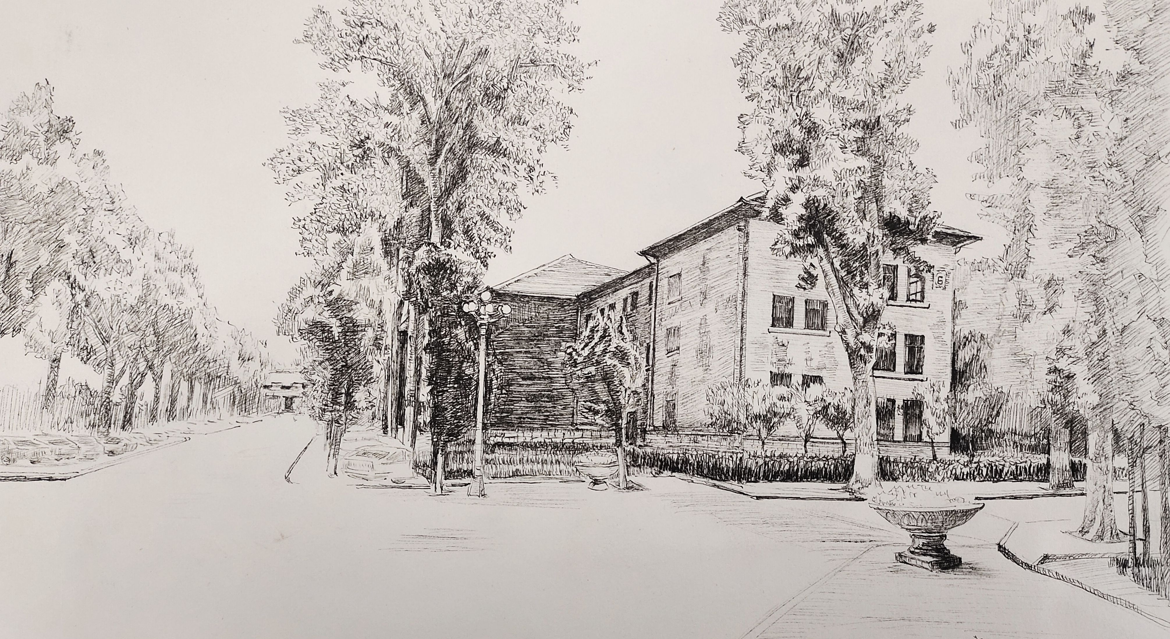 那年那天即想用笔描绘一下,虽久已生疏,仍慢慢画起。今日老校,肃然依旧。