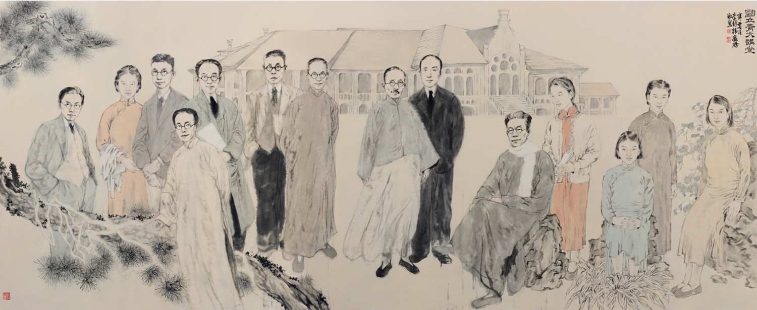 画面中心人物是与国立青岛大学、国立山东大学的成立、发展息息相关的先贤、学者,包括蒋梦麟(时任教育部部长)、蔡元培(国立青大筹办委员会主任)、杨振声(国立青大校长)、闻一多(国立青大文学院院长、中国文学系主任)、赵太侔(国立青大文学院教授、教务长,国立山大校长)、老舍(国立山大中文系教授)、方令孺(国立青大中文系讲师兼女生管理)、沈从文(国立青大文学院讲师)、张兆和(图书馆英文书目编辑)、梁实秋(国立青大外文系主任、图书馆馆长)、洪深(国立山大外文系主任)等人物,以及几位年轻学子的画像。背景以国立青岛大学礼堂作为标志性建筑,选取青岛地区常见的松石环境凸显地域特色,主要突出了山东大学在青岛办学时期校园浓郁的人文气息与师生们的儒雅风度。