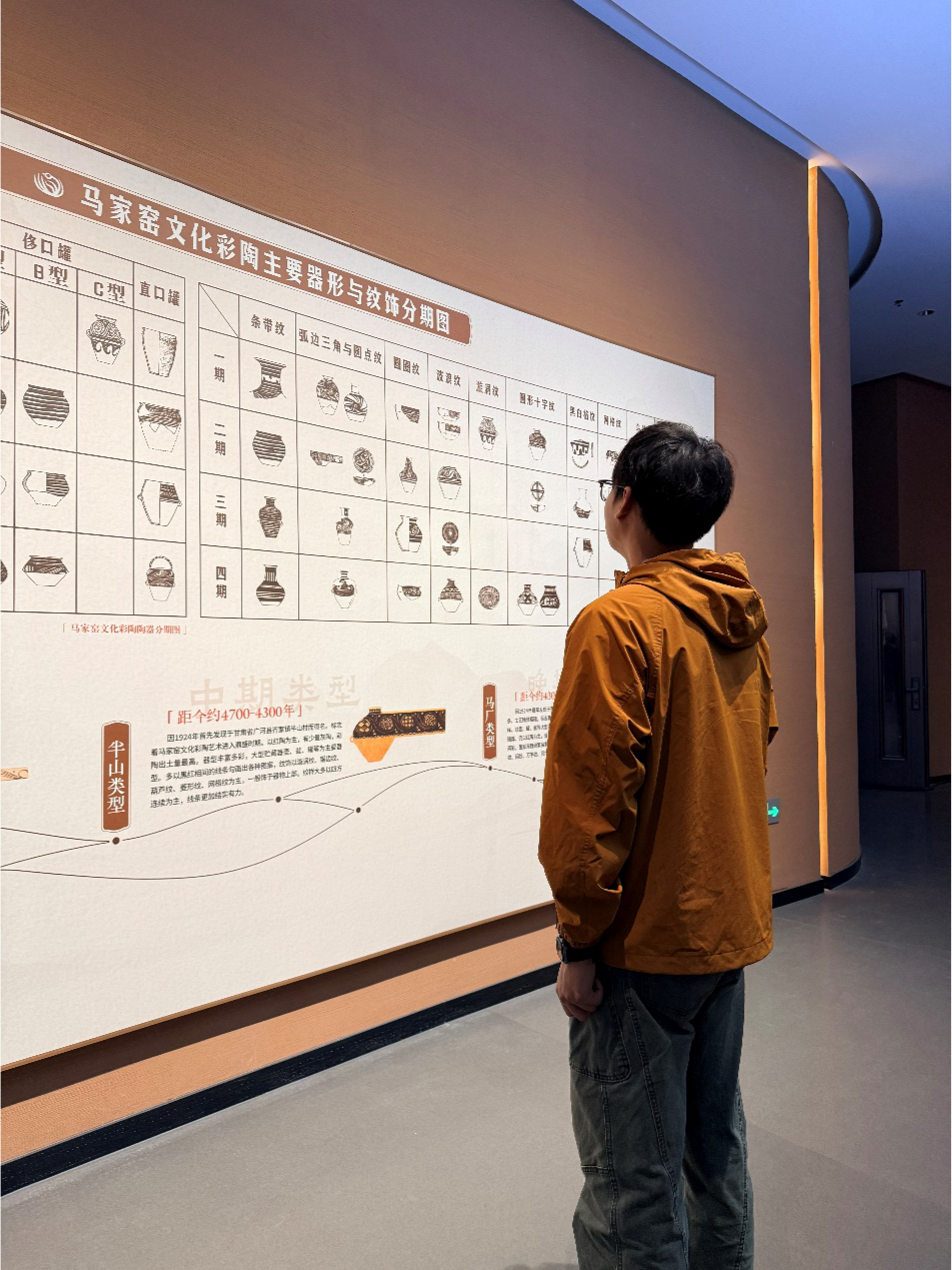 下午走进展厅,玻璃柜里的彩陶比照片上更震撼。讲解员指着一件半山类型的漩涡纹陶罐说:“这些线条不是随意画的,是先民坐在洮河边,看着水流旋转激荡,一笔一笔描下来的。”我凑近看,那些黑色的线条虽然历经五千年,依然流畅有力。一位同行的伊朗学生说起,这个蛙纹很像古代波斯陶器上的图案。我们俩查了手机,发现还真是这样。不同文明都对青蛙这种代表雨季来临的动物有着相似的崇拜。我们在专业课上学到的跨文化交际知识,正活生生地发生在眼前。
