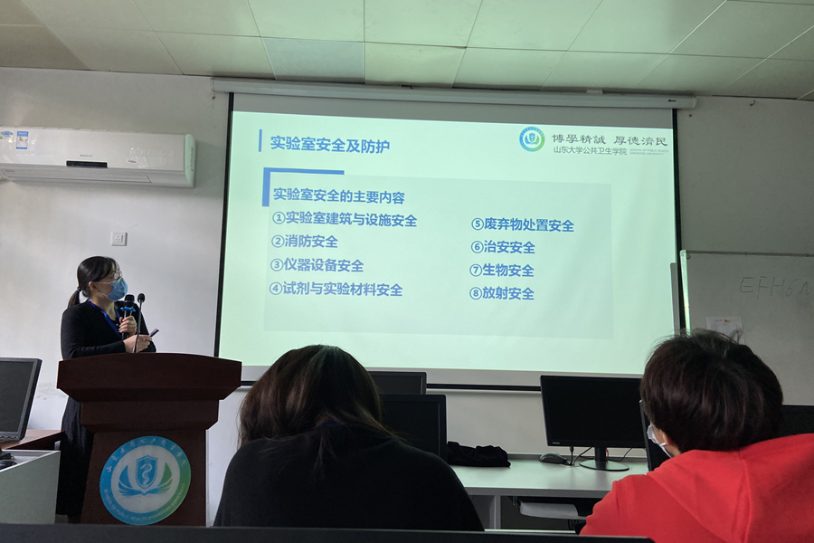 在进行了签到备案后,同学们入座坐好,首先刘娜老师简单介绍了各个实验室的情况,让我们对公卫楼各实验室的分布情况有了初步的了解,公卫楼一共包括6个实验室平台,每个实验室又根据功能不同划分了不同的房间。之后进行实验室安全及防护的讲解,主要包括实验室建筑与设施安全、消防安全、仪器设备安全、试剂与实验材料安全、废弃物处置安全、治安安全、生物安全、放射安全,刘娜老师强调了在进入实验室之前一定要有安全意识,仪器设备、器材注意事项要看仔细,操作要规范,在离开实验室之前务必检查是否关闭了门、窗、水、电源、气体等。