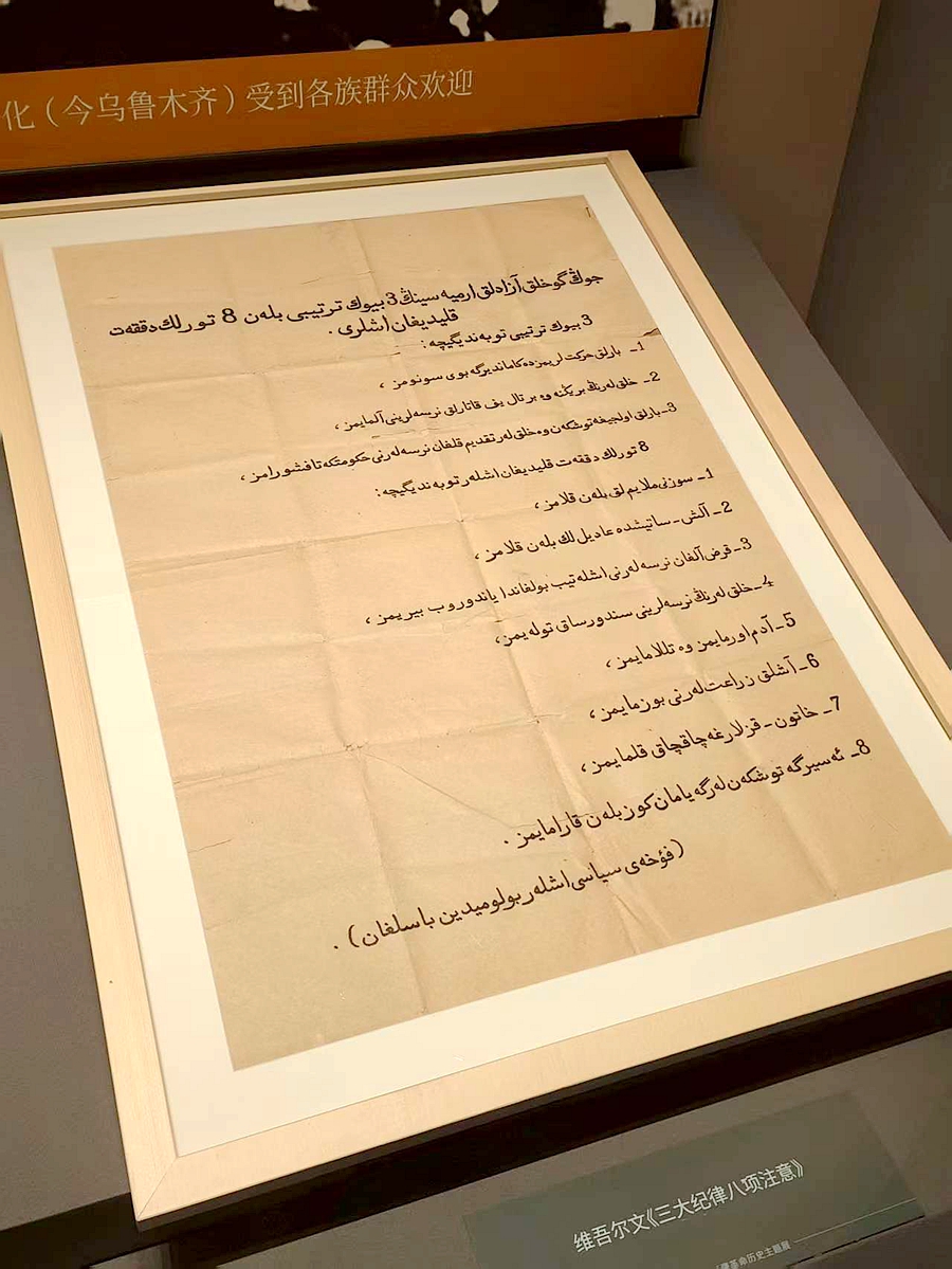 参观途中,我们的队员热依汉古丽·吾普尔同学在一份用老维吾尔语撰写的《三大纪律八项注意》文献前停留了很久。她告诉我们,小时候奶奶曾带她来过这里,逐字逐句地把这些话翻译成汉语解释给她听,让她深刻体会到中国人民解放军对新疆建设发展做出的巨大贡献。这让我对这些文物背后的故事更加感兴趣了。