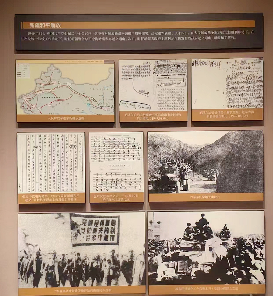 一走进博物馆二楼800平方米的展厅,“永远跟党走”五个鎏金大字就映入了眼帘,特别醒目。展览以“开天辟地”“改天换地”“翻天覆地”“惊天动地”四大篇章为脉络,通过105组革命文物、400余幅历史图片,还有全息投影技术及场景复原,全方位展现了党在新疆维吾尔自治区领导各族人民从黑暗走向光明、从落后迈向进步的壮阔历程,就像一本立体的教科书,把百年党史生动地呈现在我们眼前。
