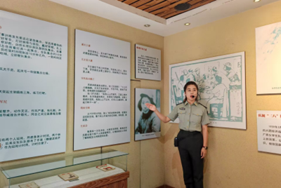 青砖灰瓦的院落静立在坡地上,门楣上“团结、紧张、严肃、活泼”八个红漆大字虽历经风雨,仍透着一股精神气。讲解员是位身着制服、干练端庄的老师,臂膀别有“国防动员单位”的臂章,开口时声音清亮:“1939年,抗大一分校从延安辗转来到这里,学员们白天开荒种地,晚上在油灯下学理论、练射击,最多时全校有两千多人,最小的学员才十四岁。”展室里陈列着一张张泛黄的照片、一件件斑驳的实物,生动再现了当年学员们在极其艰苦的条件下依然坚持学习的场景。土坯房、油灯、粗布军装,这些看似普通的物品,却凝聚着革命先辈们坚韧不拔的精神。我凑近看,这些衣服的补丁多达十几处,针脚歪歪扭扭,却像一道道年轮,刻着岁月的艰辛。墙上的老照片里,学员们背着步枪在田埂上上课,膝盖上摊着油印课本,身后是起伏的太行山脉,他们的眼神亮得像山巅的星。讲解员告诉我们:“有位叫沈绍龙的学员曾作打油诗一首——祠堂庙宇当课堂,大树底下好会场。革命理论马列讲,桌椅板凳双膝上。”正是秉承这样一种精神,抗大一分校才“越抗越大”,成为锻炼无数钢铁干部的熔炉。