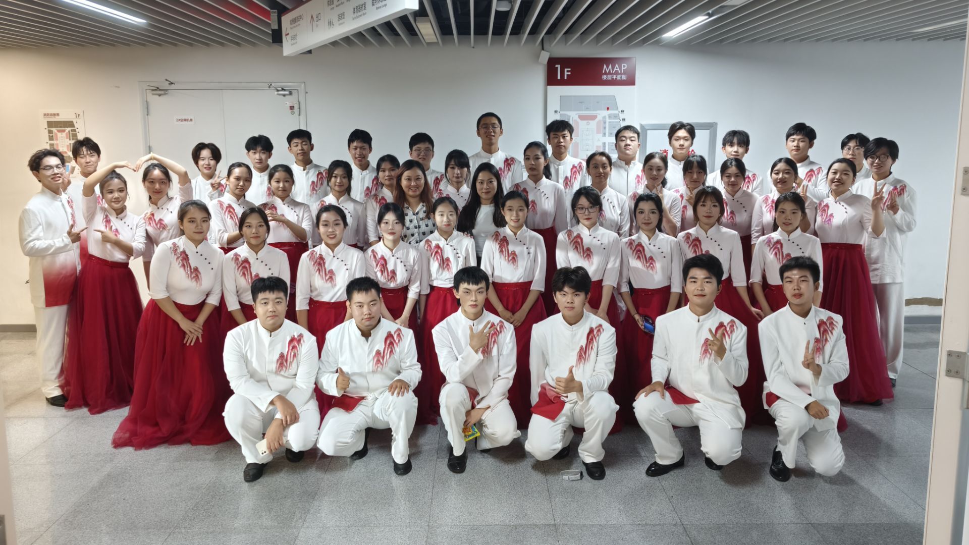 审核环节,牛老师指出我们“情感递进不足”。当晚,六个学院的队员围坐分享故事,这些来自不同专业的家国实践,成了和声里最真挚的“情感密码”。服装的设计也凝结集体智慧,白色上衣的红色山水纹样改了三版,最终呈现出“既如火焰般炽热,又如水墨般雅致”的视觉效果,恰如多元学院背景下的同样的赤子之心。