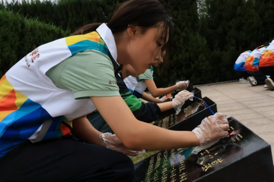 敬献鲜花时,我按顺序上前,将白菊轻轻放在碑前。指尖抚过花瓣,想起曾在西藏为牺牲的边防战士扫墓的场景,同样的肃穆,同样的敬意。随后的描红工作中,我戴上手套,蘸取油漆仔细勾勒碑文。阳光落在碑石上,让逐渐清晰的“烈士永垂不朽”六个字更显庄重,我突然明白:我们描红的不只是文字,更是不能忘却的记忆;就像在高原上巡逻时,每一步都踏在前辈守护过的土地上,每一次坚守都在延续他们的信仰。