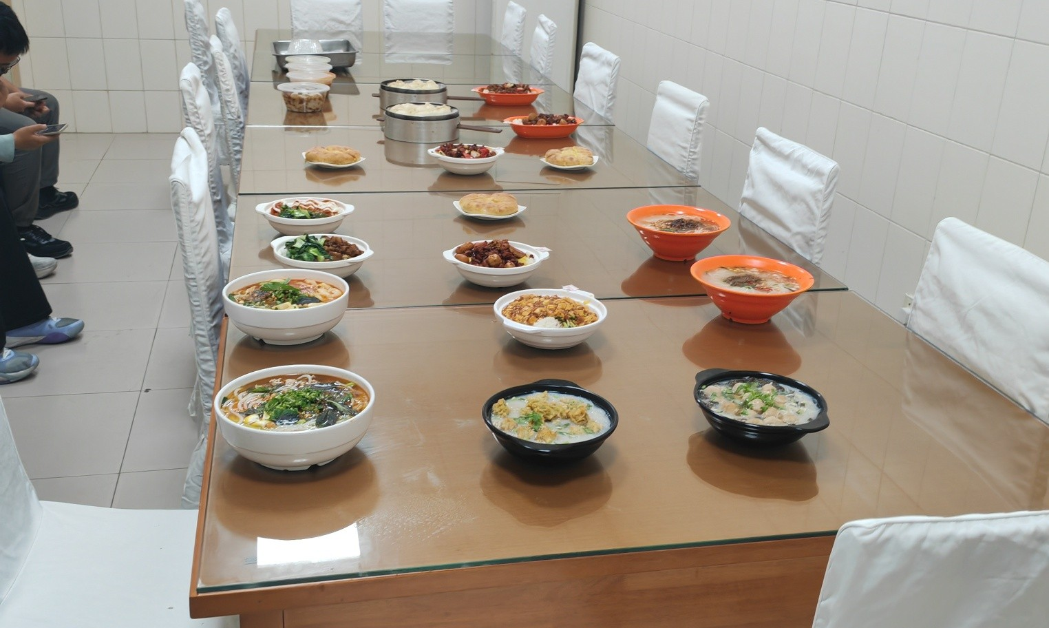 跟着琳老师走上二楼的会议室,踏进门口的瞬间,我们不约而同的“哇”声回荡在走廊里——十几道新品摆得满满当当:榴莲面包的表皮烤得金黄酥脆,米粉被浇上了红亮的酱汁,上面撒着翠绿的葱花,牛肉粉丝汤蒸腾着热气,汤面上飘着好多薄切的牛肉,热气裹着鲜香往鼻尖钻,还有圆润的丸子浸在粉丝汤里。空气中交织着各种香气,每个人都沉浸其中。
