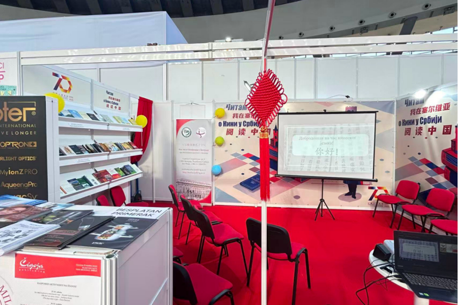 我们的展区前,红色的中国结在微风中轻轻晃动,与背景板上“我在塞尔维亚阅读中国”的中塞双语标语交相辉映。书架上,《习近平谈治国理政》《诗经》等书籍整齐排列,还有多种塞语涉华书籍,从中国历史文化到当代发展,琳琅满目。