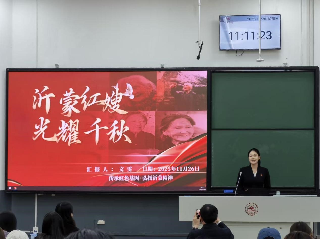 在宣讲后的互动环节中,作为音乐学专业的我向老师提出了一个问题:时至今日,沂蒙精神该如何用艺术的形式传播下去呢?老师细心地解答了我的问题,之后又有几位同学举手,老师也一一耐心地回答。通过互动,我们更深刻地了解到,我们可以发挥自身专业优势,用多种艺术形式和数字技术传承和弘扬中国革命精神。
