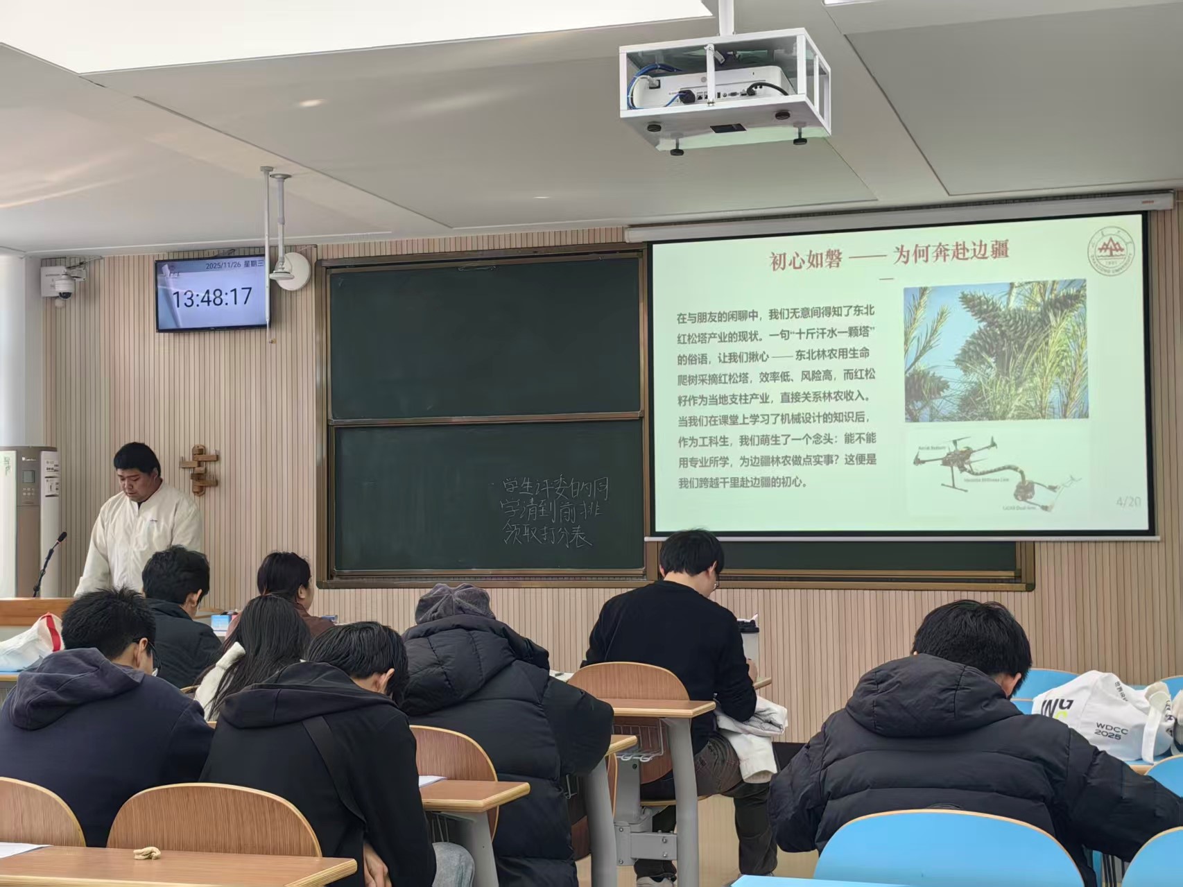 轮到我上台时,虽有些紧张,但一想到边疆的风雪、林农的期盼,心中便多了份坚定。我向大家分享了我们绿松创客调研团的边疆实践之旅:从一句“十斤汗水一颗塔”的俗语萌生初心,到跨越千里奔赴黑龙江林场;从寒冬里顶着零下几十度低温测试设备,到跨界学习为机械臂加装柔性夹具和红外预警模块;从被林场工人质疑,到最终听到那句“这个设备真能帮我们省不少力”的肯定。演讲中,那些实践里的艰辛与收获仿佛就在眼前,我也更加清晰地感受到,把专业知识转化为实际价值的成就感。