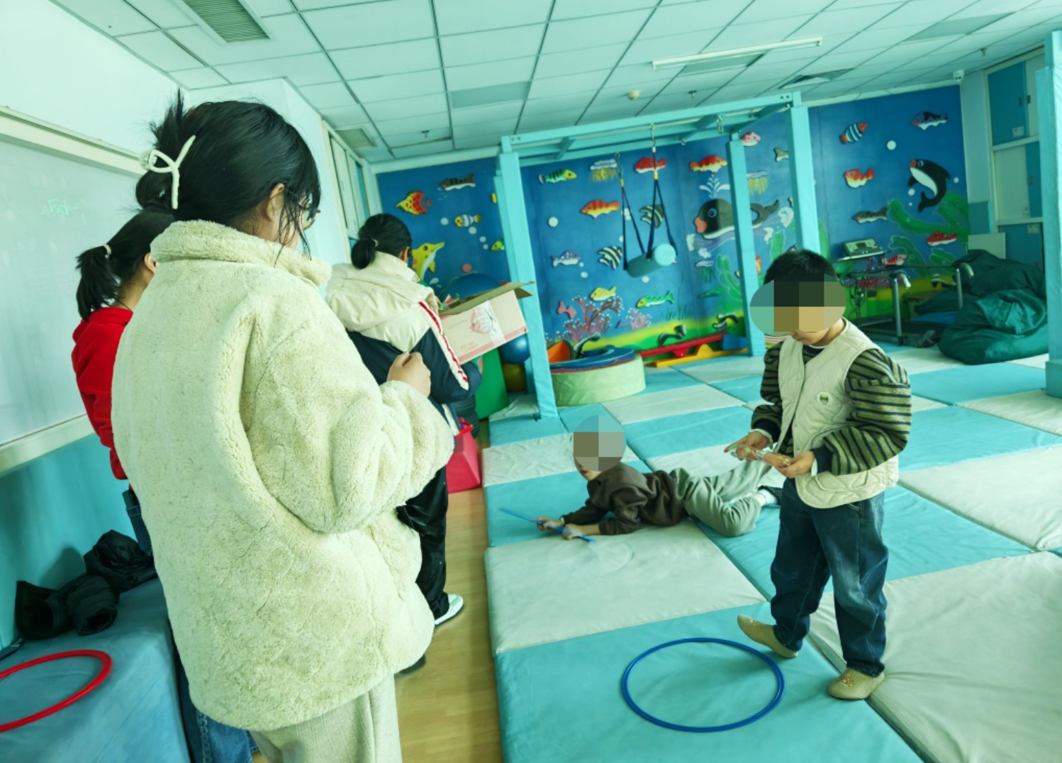大厅里,童飞老师正微笑着等候我们。“欢迎你们。”他的声音很温和,“这里的孩子大多存在不同程度的智力发育迟缓,有些还伴随动作发育滞后,他们对外界的善意很敏感,但需要更多耐心和包容。”老师指着墙上的公益标语“让每个孩子都能被世界温柔以待”,轻声补充道,“我们坚持免费服务,就是希望让那些经济困难的家庭,也能毫无负担地带孩子接受专业康复训练。”朴实的话语里满是力量,让我们原本有些紧张的心情渐渐平静,对接下来的相处更添了几分郑重。