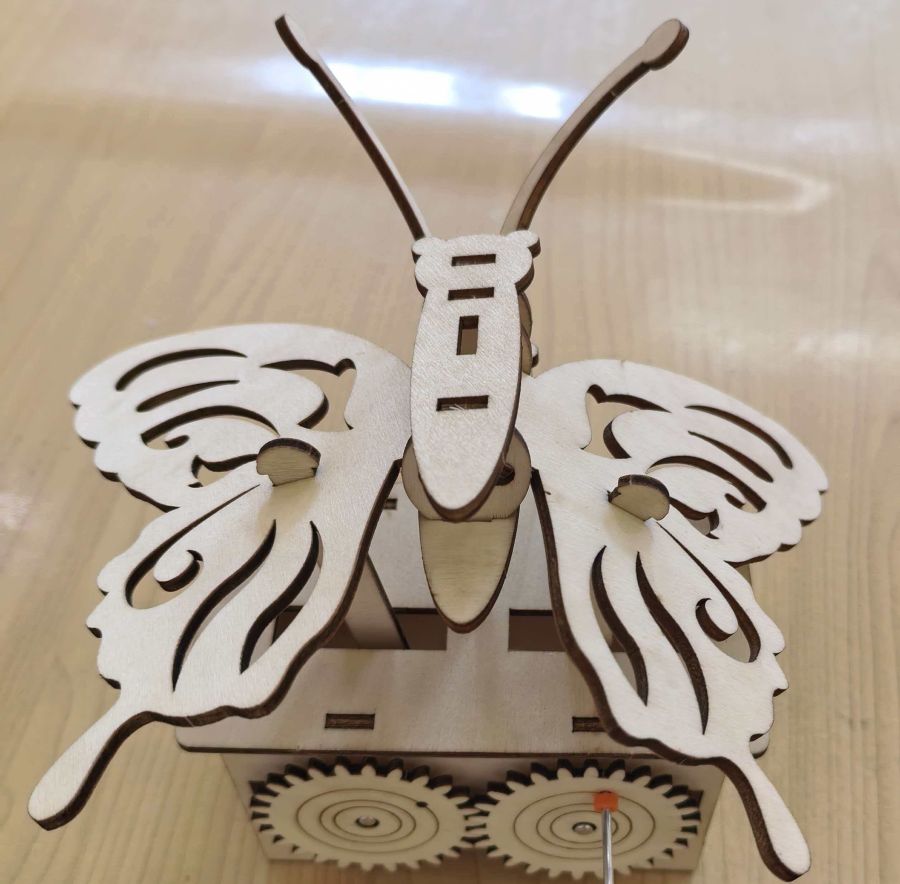 在手工制作环节,我们准备了木制蝴蝶模型,并带着小朋友们逐步完成了模型组装。每一组的小朋友,经过详细的分工合作,在小老师的指导下,认真细致地完成了木板拆卸、材料分类和连接组装过程。他们学会了和同伴团结合作、互帮互助,学会了遇到问题时要积极发散思维寻找解决问题的方案,学会了有疑惑要主动提问,向老师、同学寻求帮助。在完成有意思的小手工的过程中,他们还学到了齿轮的种类、用途,多个齿轮结合的运行原理,转轴如何同步以及基本的材料组装技巧。在展示环节,大家都兴高采烈地转动着作品转轴,放生蝴蝶的翅膀翩翩起舞,在孩子们的手中奇迹般地“活”了起来。
