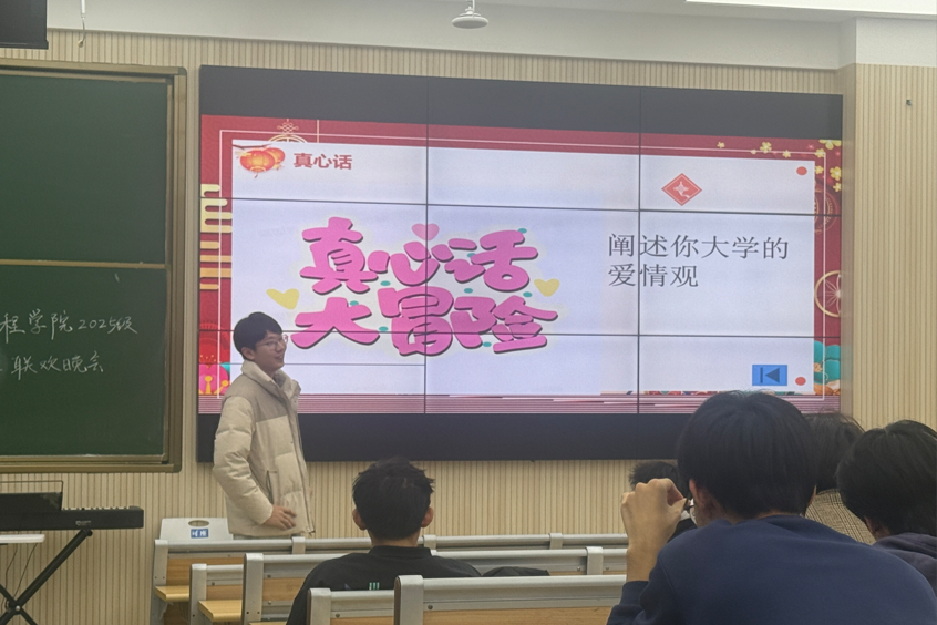 晚会开场不久,击鼓传花环节便点燃了全场的热情。随着鼓点响起,鲜艳的花束在同学们手中飞速传递,大家的目光紧紧追随着花束,掌声与欢呼声此起彼伏。花束落到我手里的那一刻,鼓声突然停止,周围瞬间安静下来,随即响起同学们鼓励的呼喊。我有些羞涩,一时不知该做些什么,这时身旁的同学轻声安慰:“别紧张,随便表演点什么都好,我们都支持你!”站到台上准备抽签,“真心话还是大冒险?”我的内心忐忑,望着屏幕,我抽中了一个意想不到的结果——空!台下立马为我的好运响起激烈的欢呼声……这个简单的游戏,没有输赢,不分你我,每个人都沉浸在这份纯粹的热闹里,笑声交织成一片,温暖了整个会场。