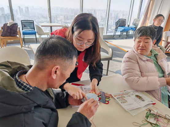 听完鲁绣的故事后,活动迎来了最令人期待的环节——亲手制作鲁绣发卡。活动室里暖意融融,阳光透过窗户洒在绣布上,映得各色丝线愈发鲜亮。起初,面对精巧的刃针,几位年长的参与者有些迟疑,不好意思主动求助。我看到后,便逐一上前询问是否需要帮助。打消顾虑后,叔叔阿姨们纷纷主动提问,有的请教针法技巧,有的询问怎么调整绣绷,活动室里渐渐热闹起来:穿线声、低语声、会心的笑声交织在一起。针起针落间,一幅幅小巧玲珑的绣样慢慢成型。