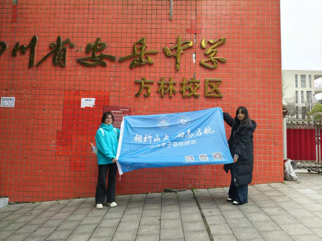 最后我们回到了乐至中学的校门口,举起母校回访的旗帜,六个人站成一排,对着镜头喊出那句口号:“从蜀地出发,在山大相遇。”快门按下,光影定格,身后是沐浴在晚霞里的学校,身边是并肩作战的队友,手中是写满故事的旗帜。