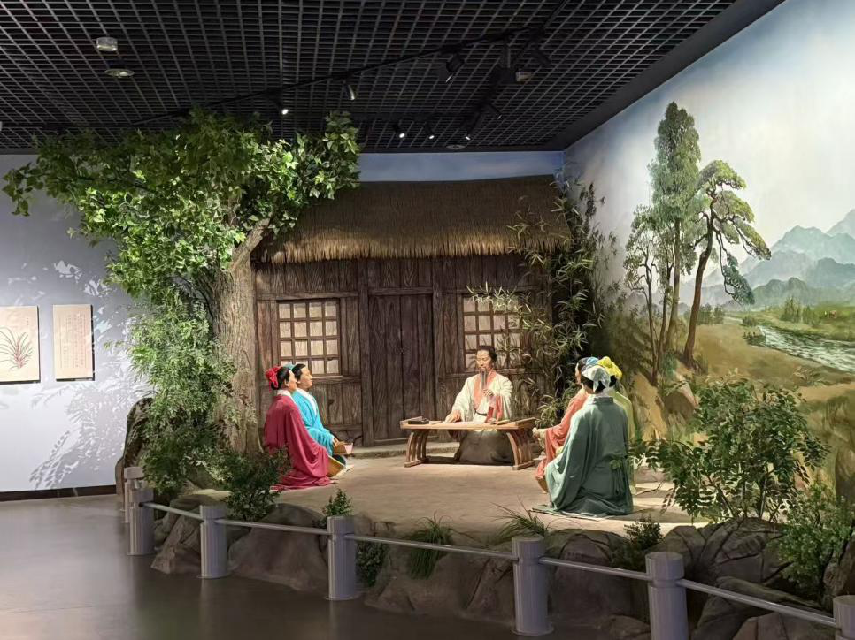 走到“郑玄讲经”的场景复原前,我不自觉地停了很久。茅草屋下,先生端坐授业,弟子们围坐聆听,青山绿水作背景,一派安然。仿佛有轻柔的书卷声在耳边回荡,穿越千年依旧清晰。展板上说,东汉末年,经学大师郑玄曾在此避乱讲学,文脉就这样在这片土地上,一代代薪火相传。旁边展柜里的陶壶、陶豆,带着淡淡的泥土气息,质朴又温润,让我忽然想起课本里的“箪食瓢饮”,原来那些遥远的典故,那些课本上的文字,真的曾在这片土地上真切发生过。