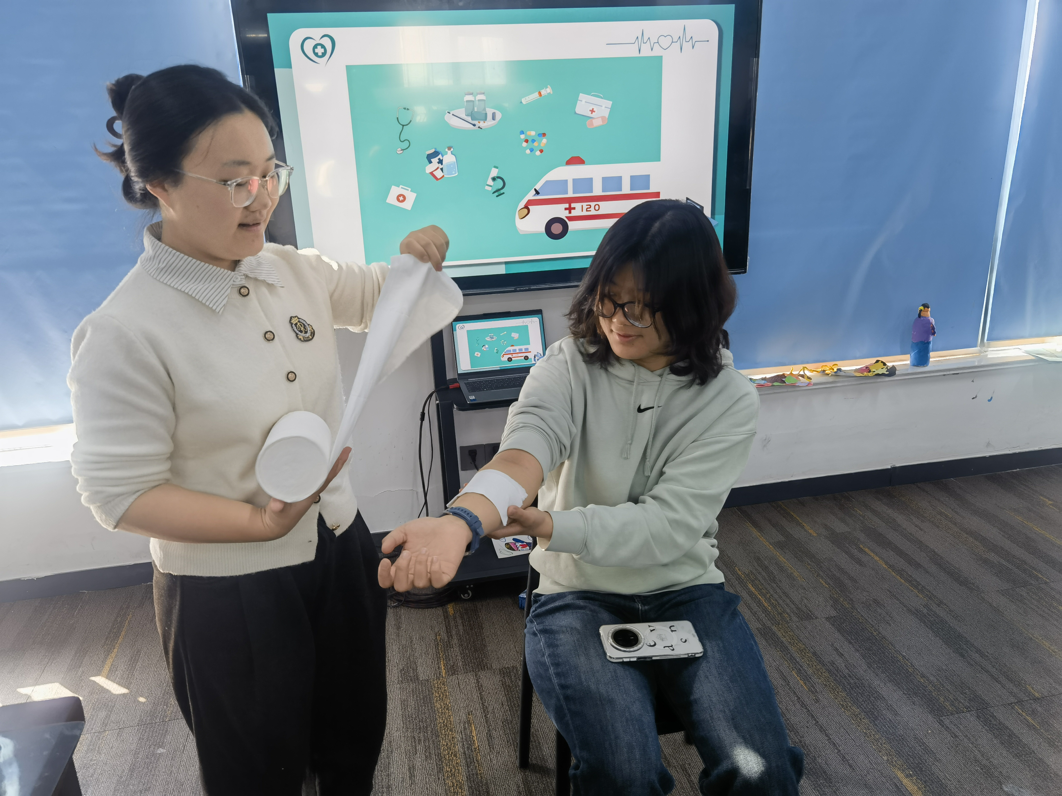 队友用卫生纸演示包扎伤口。卫生纸缠上我的手臂时,小同学们都聚精会神地看着队友用专业的手法演示环形包扎、螺旋包扎。队友一边操作一边讲解:“第一圈要压住绷带头”“压力要均匀,不能太紧也不能太松”。那卷普通的卫生纸在她手里仿佛真的变成了救死扶伤的绷带,将高深抽象的专业知识转化为真实可感的实际操作,将生命急救知识灌输给小同学们。