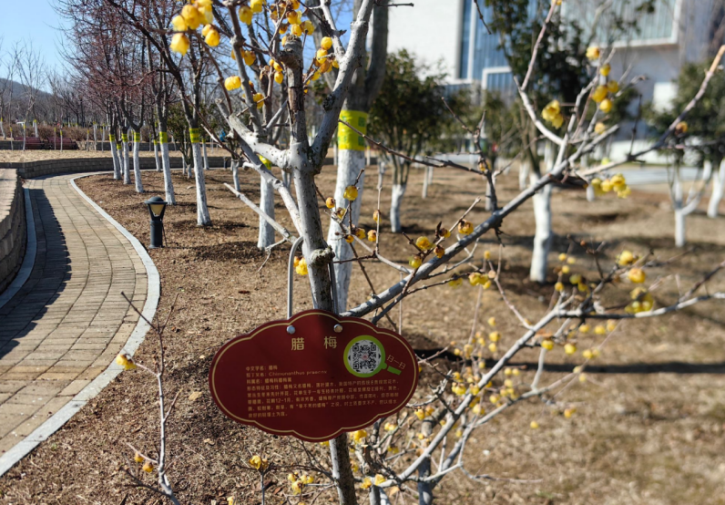 走到振声苑东边的角落,我们遇见几株腊梅。枝头凝着嫩黄的花骨朵,星星点点嵌在褐色枝丫间,透着勃勃生机。我们轻手轻脚地扶着腊梅的枝干,小心地将印着“腊梅”二字的标识牌固定在树干适中的位置,牌面的扫码标识清晰可见。这小小的牌子,成了腊梅独有的“身份名片”。