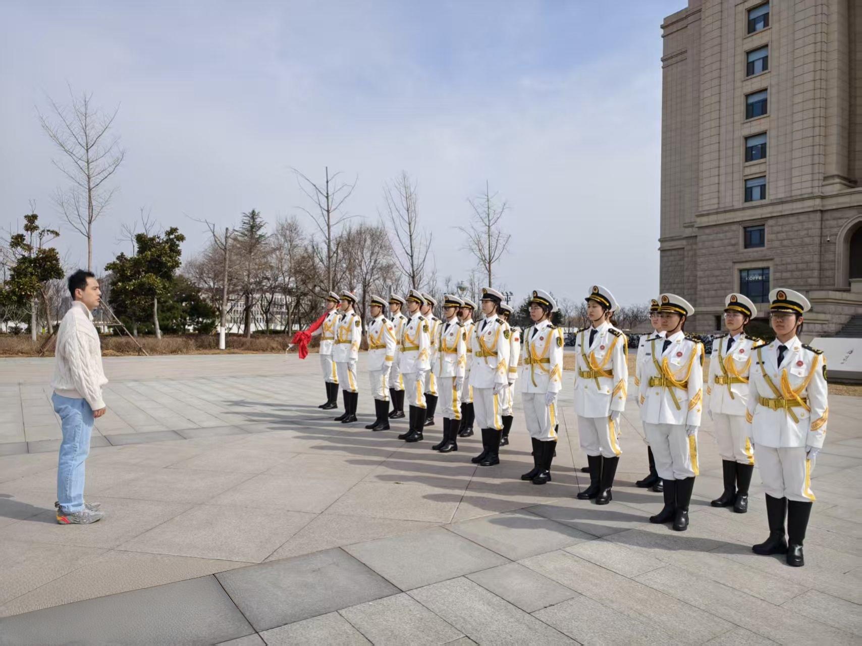 清晨六点半,天刚透出鱼肚白,我就站在了青岛校区图书馆前的广场上。初春的海风裹着寒意,吹在脸上像细针在扎,但我顾不上这些——今天是国旗班的常规训练,每一秒都容不得松懈。