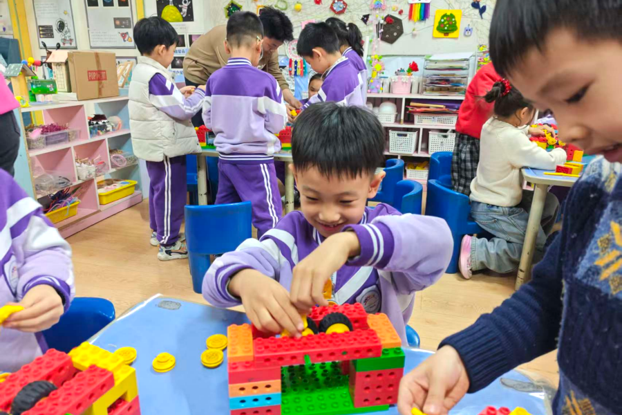 当孩子们遇到积木拼接不牢固、齿轮无法啮合的问题时,我们没有直接给出答案,而是通过趣味提问引导他们自主思考,同时鼓励他们和小伙伴交流探讨、反复尝试。他们个个热情高涨,有的围坐研讨思路,有的分工协作互帮互助,在亲手操作中感知结构的稳定性,在攻克难题中锻炼逻辑思维。当一个个造型各异的“大力挤压机”顺利运转时,孩子们的脸上满是成就感,举着作品向我们展示,教室里也满是欢声笑语。