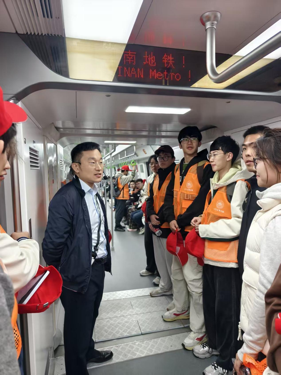 活动当天,我们在兴隆山校区综合实验楼下集合,乘校车前往千佛山校区后换乘地铁。途中,巴兴之老师以济南地铁为实例,为我们上了一堂生动的移动专业课。他详细讲解了济南地铁从线路修建到智慧运维全流程中的山大担当,重点介绍了学院在岩土工程技术攻关、地下工程施工优化、智慧交通系统研发等方面发挥的核心作用。我真切感受到了专业的价值,心中满是自豪与归属感。