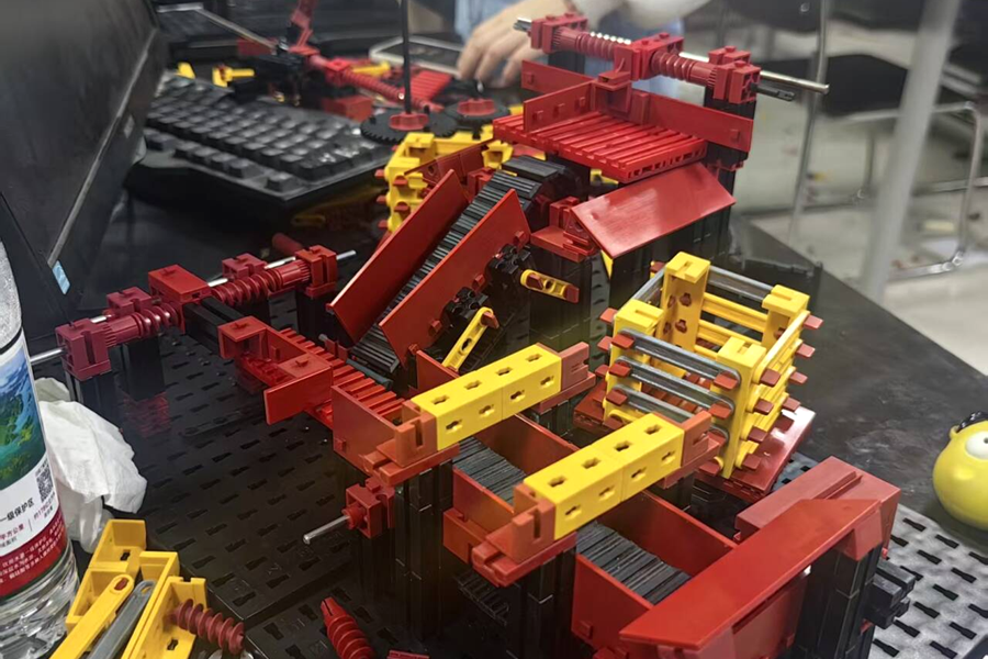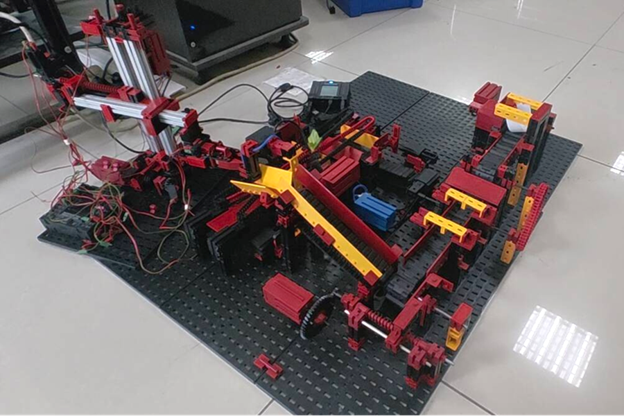 我们围绕在实验台前,先针对之前发现的问题调整参数。比如切根模块的齿轮之间出现的咬合卡顿问题,我们反复查阅《机械设计手册》优化传动比,又多次拆装零件调整装配精度,现在齿轮运转已经顺畅了很多;去黄叶机械臂的行程位移不准,我们就在慧鱼编程软件里反复调试电机参数和程序,终于把重复定位误差稳定在了合适范围。实验室里的零件碰撞声、编程软件的运行提示音,还有我们团队讨论方案的声音,一直没停过,为了比赛,每个人都全力以赴。
