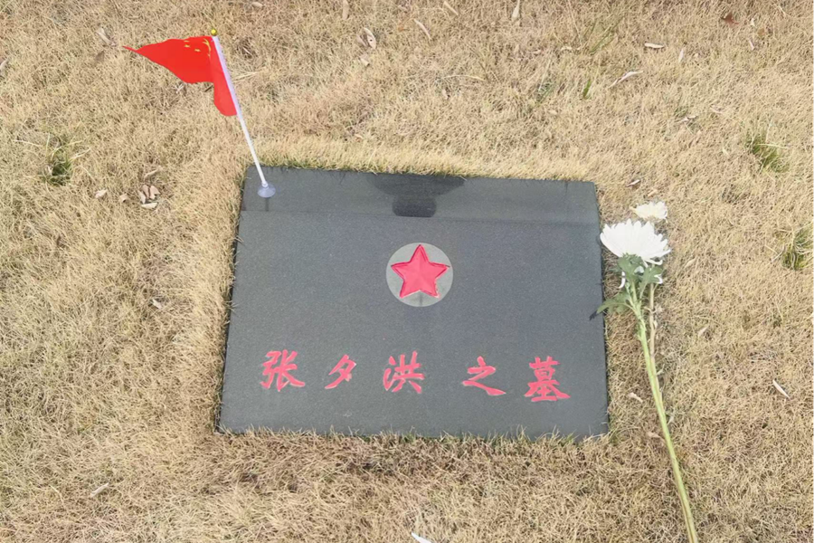 国旗仪仗队迈着整齐的步伐送来花圈,迎国旗、送国旗,我在大墓右四区,被分到张夕洪烈士的墓前。同样的三鞠躬后,大家都蹲下身开始擦拭墓碑。用湿布轻轻拂去碑面上的灰尘,我看见墓碑正中,一颗红星和烈士名字在擦拭中渐渐鲜亮起来,红得耀眼,像是刚刚刻上去的。