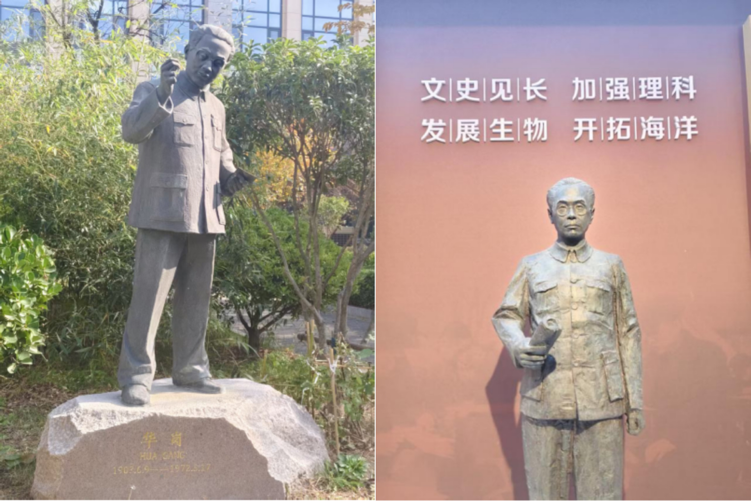 我先来到振声苑北边的华岗苑。华岗苑前立着一尊华岗校长的雕塑——目光沉静,面容清癯,微微前倾的身姿像是在倾听,又像是在讲述。我站在雕塑前看了很久,试图从这凝固的青铜里,与校长跨时空对话:华岗校长经历过什么?相信着什么?又是怎样把信念传递给一所大学的?