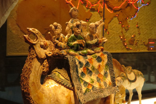 沿着展厅缓步前行,我们细细观赏每一件文物,当走到唐三彩骆驼载乐俑展柜前时,人们不自觉地停下了脚步——这件国宝级文物远比想象中更震撼。入眼先见一匹高大的骆驼昂首伫立,四肢稳健,驼峰圆润,周身施以黄、绿、白三色釉彩,釉色浓淡相宜、温润光亮,尽显盛唐工艺的精湛。视线流转,见骆驼背上搭建着平台,数位乐俑围坐一圈,手持不同乐器,神情专注地作演奏状,中间还有一位舞俑身姿曼妙,翩翩起舞,人物神态栩栩如生,服饰纹样细腻逼真。