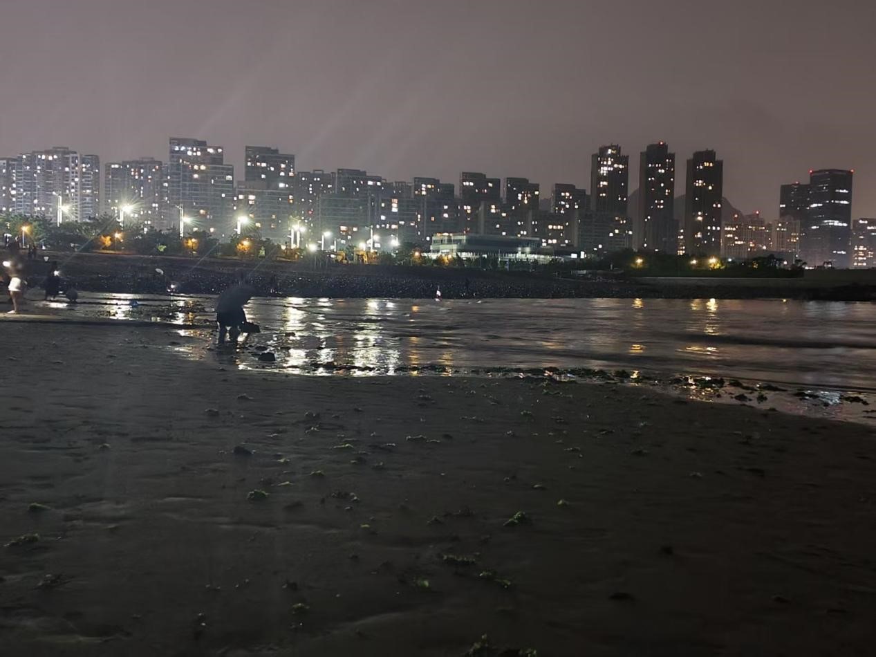 按提前查好的夜潮时刻表,我在寻了块石头坐下。刚关掉手机手电筒的微光,远处便飘来一阵隐约的声响。浪花、潮流顺着海面慢慢往这边压。抬眼望时,海面仍是一片浓黑,只有远处航标灯的红光在浪里浮沉,模糊了水与天的边界,连风都好似停了,只剩那股声响在空气里慢慢聚积。