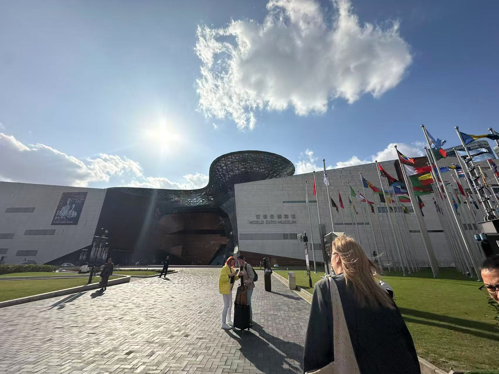 今天下午去了世博会博物馆,这是我这次设计考察上海之行最期待的行程之一。说实话,站在博物馆门口的时候,我完全被这座建筑的独特气质震撼到了。米色的砂岩墙体厚重沉稳,像是承载着历史的重量,而头顶上那些三角玻璃组成的“云朵”却在阳光下闪闪发光,轻盈得仿佛随时会飘走。这种强烈的对比让我在门口驻足了好久,忽然觉得,好的设计大概就是这样吧——既要有沉淀的底气,又要有飞翔的勇气。